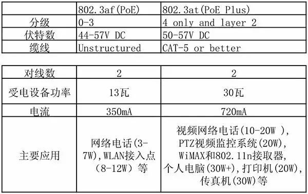 與IEEE802.3af相比,IEEE802.3at可輸出2倍以上的電力,每個端口的輸出功率可在30W以上,因此可大幅拓寬PoE的應用領域。表1為IEEE802.3af與IEEE802.3at的對比。