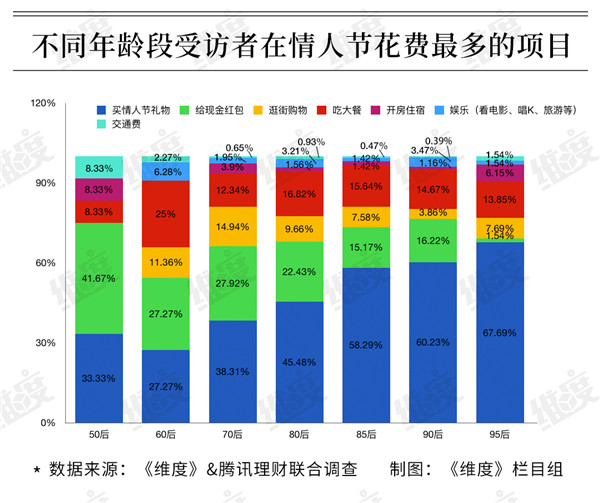調查指出,95后當中不少還未走上社會,有38.1%的學生情侶,其節日花費主要來自父母,還有10.77%的95后依靠花唄、借唄、信用卡等消費貸款“借錢”過“情人劫”。總體而言,越年輕越容易受到浪漫氛圍的感召,為過節花的錢也越多。