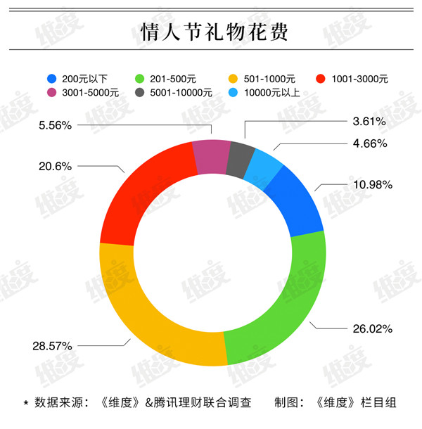 調查顯示,情人節所有花銷中,買禮物是最大的一筆情人節開支,占比過半,為此花去500-1000元的最多,有28.57%。但花千元以上買禮物的,總計超過三成。