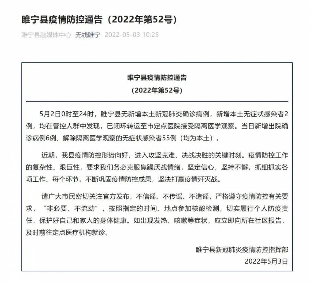 據睢寧縣新冠肺炎疫情防控指揮部5月3日發布通告,5月2日0時至24時,睢寧縣無新增本土新冠肺炎確診病例,新增本土無癥狀感染者2例,均在管控人群中發現,已閉環轉運至市定點醫院接受隔離醫學觀察。目前,該縣疫情防控形勢向好。