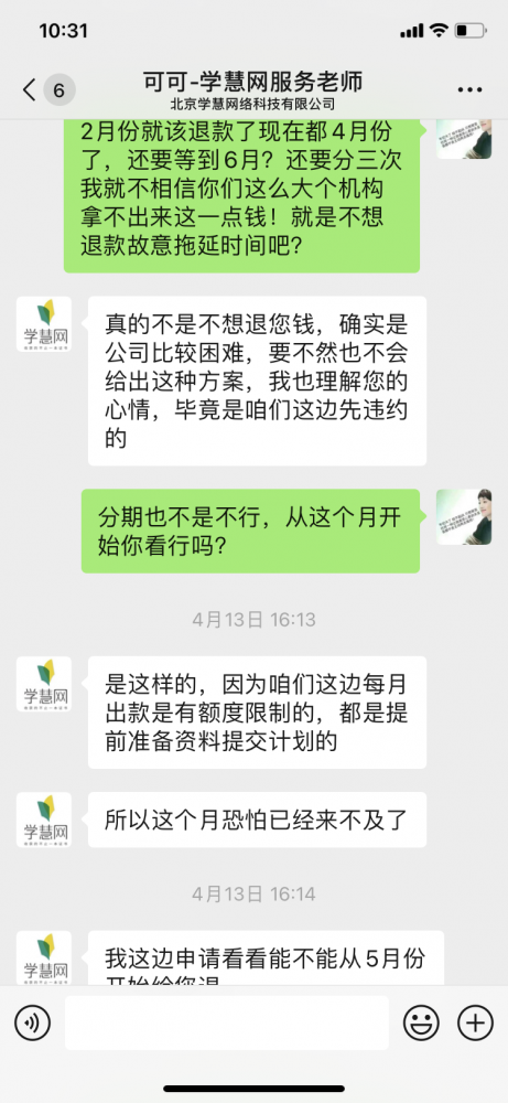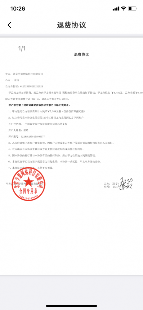 我本人2021年7月16日,因學歷提升在學慧網科技有限公司報考學歷提升網課6480元。付款成功后發現授課老師講課一塌糊涂。我立即要求退費,在我強烈要求下他們讓我簽了一份霸王條款的協議,必須扣除新生注冊費用972元,退還5508元,120個工作日內到賬。可是到120個工作日后,仍然沒有退款的意思我多次微信溝通他們一推再推。
