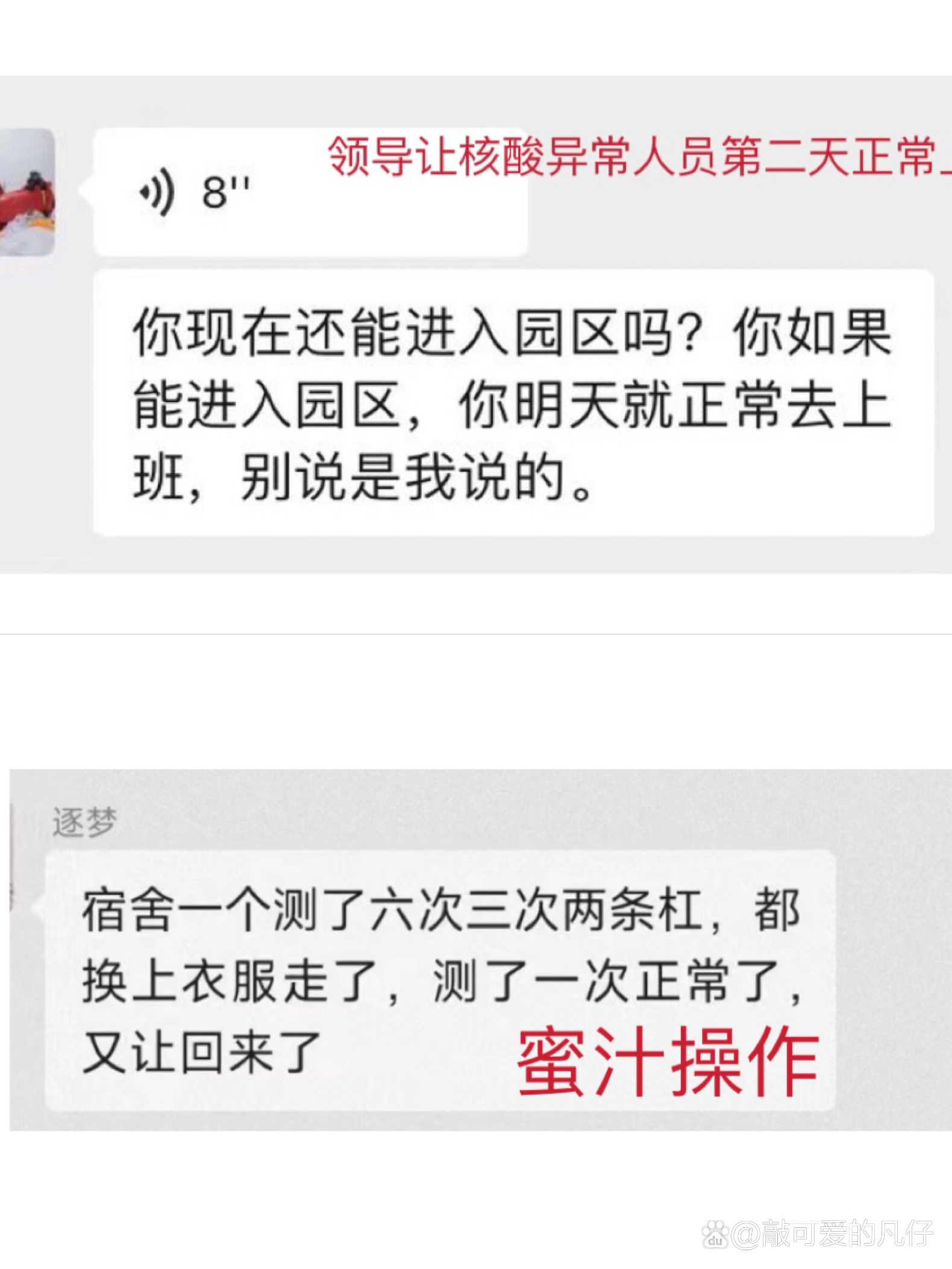 這周疫情尤為嚴重,有小組待的車間出現了混管陽性,由于每個車間核酸點都是固定的,那么說明該車間內必有陽性。出現陽性病例之后,該小組很害怕,不敢進車間上班了,但是管我們的領導依然強烈要求要進入車間,繼續定崗定位。他們聽了領導的話,緊接著,他們的核酸也出現了異常。我們聽到這個消息,感覺都很慌張,第一次感覺疫情離我們這么這么近。可是出現異常的人員并沒有被拉走,而是一直待在宿舍,等了好幾天也沒有人上門單采。再然后,菁干班出現核酸異常的人員越來越多,混陽人員不止個例,但是這時候的處理方式直接是放任不管,可以正常上班,甚至有的密接者沒有去處,無家可歸,沒人管,向領導反映,也很久才進行安排,最終在男寢一個宿舍打了地鋪。
