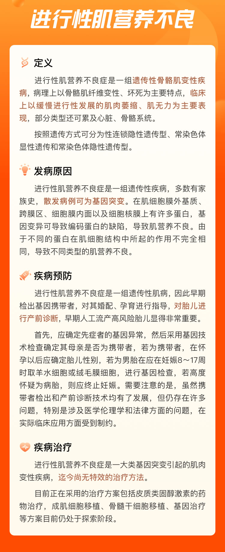 定義:進行性肌營養不良癥是一組遺傳性骨骼肌變性疾病,病理上以骨骼肌纖維變性、壞死為主要特點,臨床上以緩慢進行性發展的肌肉萎縮、肌無力為主要表現,部分類型還可累及心臟、骨骼系統。