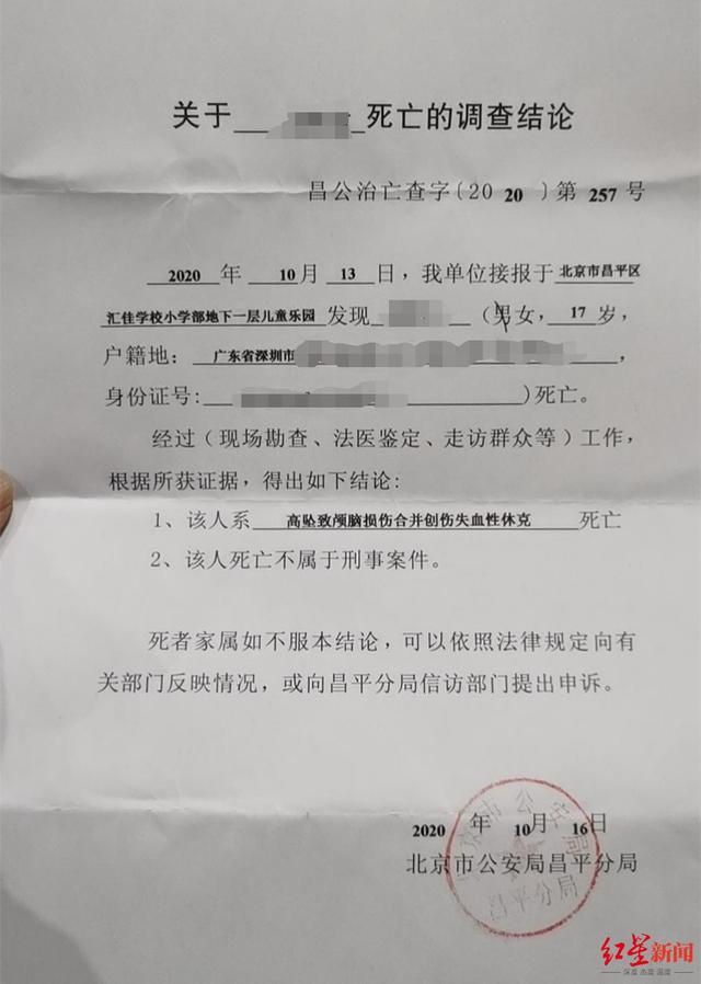 根據(jù)田先生提供的一張由北京市公安局昌平區(qū)分局出具的死亡調(diào)查結論顯示,10月13日,該局接報于北京市昌平區(qū)匯佳學校小學部地下一層兒童樂園發(fā)現(xiàn)17歲的小田死亡,經(jīng)過(現(xiàn)場勘查、法醫(yī)鑒定、走訪群眾)工作,根據(jù)所獲證據(jù),得出結論:該人系因高墜致顱腦損傷合并創(chuàng)傷失血性休克死亡;其死亡不屬于刑事案件。