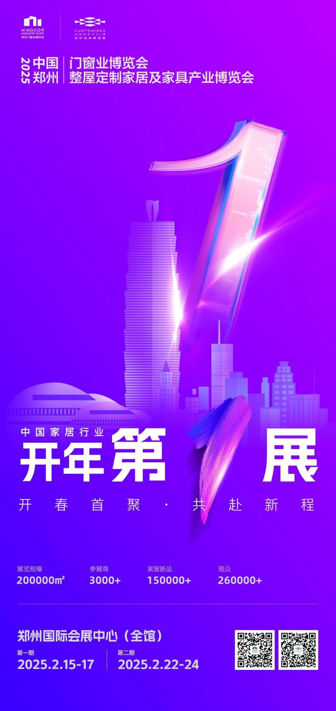 更大規(guī)模、更全品類、更多機(jī)遇!2025中國鄭州門窗業(yè)博覽會暨整屋定制家居及家具產(chǎn)業(yè)博覽會將于2025年2月15-17日/2月22-24日分兩期重磅開啟,期待與您開春相聚,共赴新程!