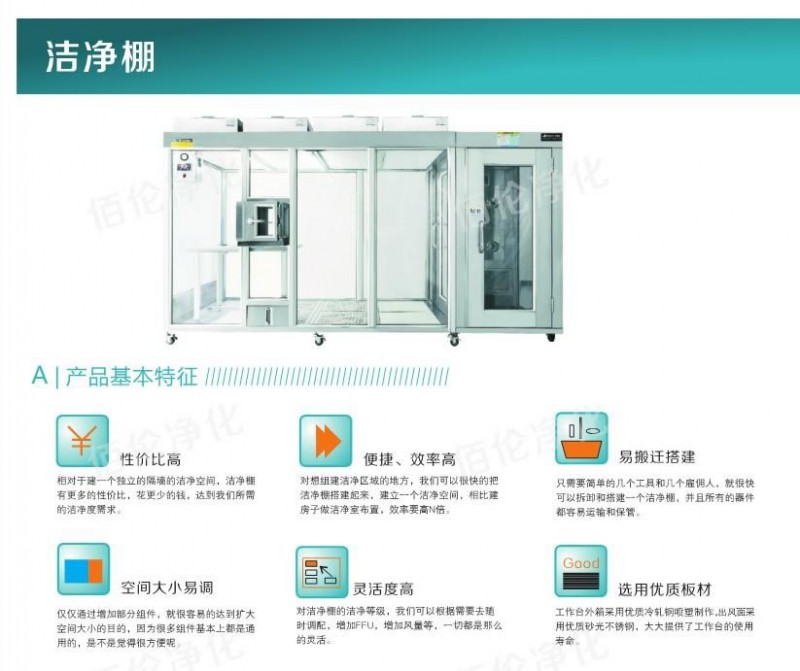 支架式潔凈棚整體框架可采用冷軋鋼板噴塑、采用全不銹鋼和鋁合金等幾種材料,重量輕、抗腐蝕、防銹、美觀大方。其他還可采用可調(diào)風(fēng)量系統(tǒng),保證工作區(qū)風(fēng)速處于理想狀態(tài),適用超凈生產(chǎn)線,多人使用方便。