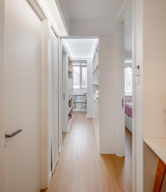 由于兩間臥室的結構進行了重組,中間也自然形成了一個通往陽臺的過道。雖說看起來有些狹長,但面積并沒有浪費,并且還起到了為室內引光的作用。