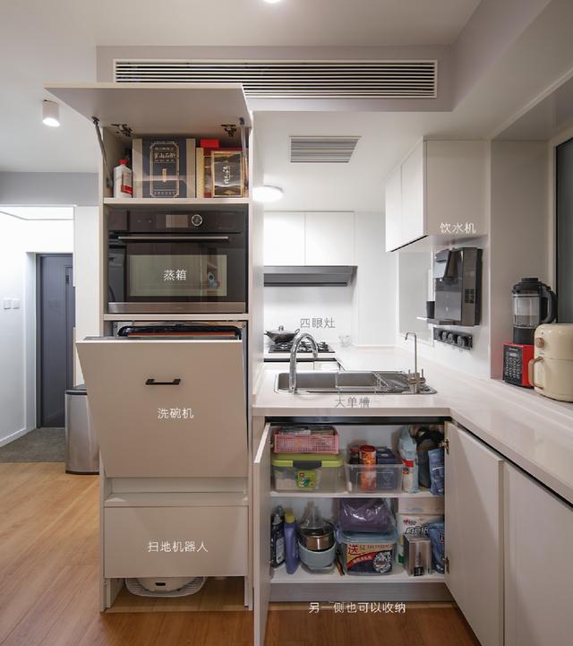兩塊空間之間增加高柜隔斷,滿足烤箱、洗碗機、掃地機器人收納。而像這種“精打細算”式的結構規(guī)劃,也最大化提升了空間收納率。