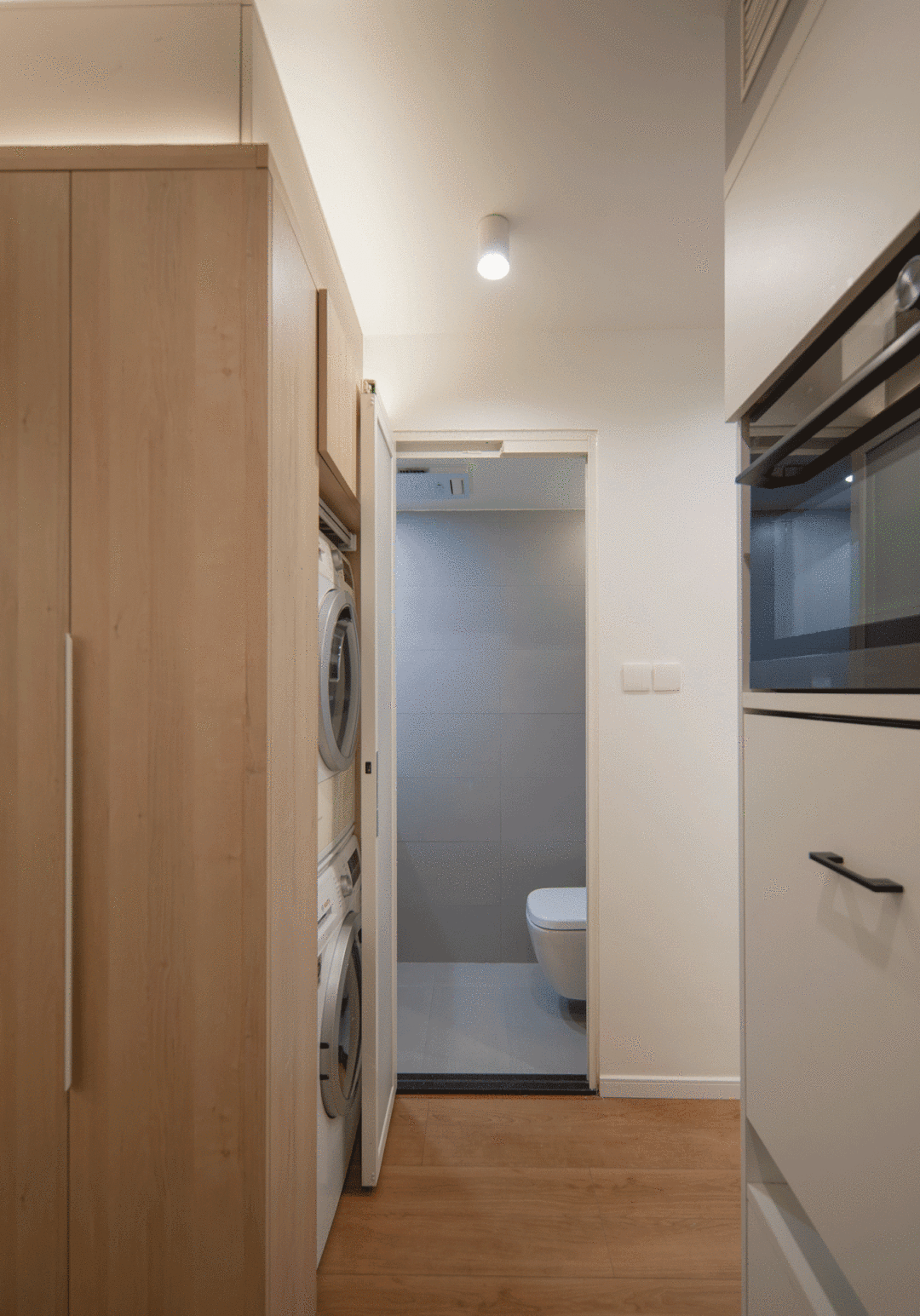 雖說內部僅增加了馬桶和洗漱,但也有效優(yōu)化了生活效率。除此之外,門外一體的家政柜設計,也讓洗烘設備和清潔工具得到了有序收納。