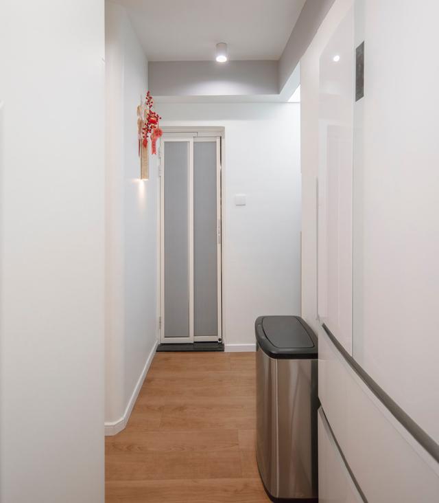 原戶型進門并沒有一塊合理的收納區(qū),所以在改造時,就利用廚房的墻體隔斷,改造出了一組日常鞋柜,以解決基本的收納需求。