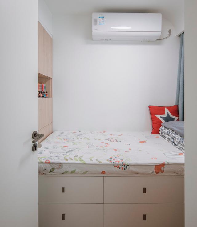 弟弟房間的布局,基本上與哥哥房間一樣。同時,兩個房間之間用柜體+窗戶隔斷,也保留下了一定的通風采光環(huán)境。