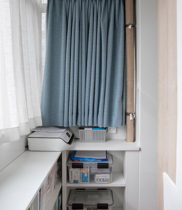 陽臺以半圍合式的結構,設計了一組低矮的開架,延續(xù)了過道的儲物能力,并且還兼具了辦公區(qū)的功能性。