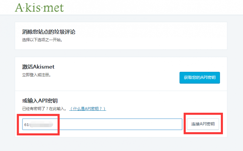 回到網站后臺管理,點擊【設置】--”Akismet“輸入我們剛才獲得的API密鑰就可以啟動了。