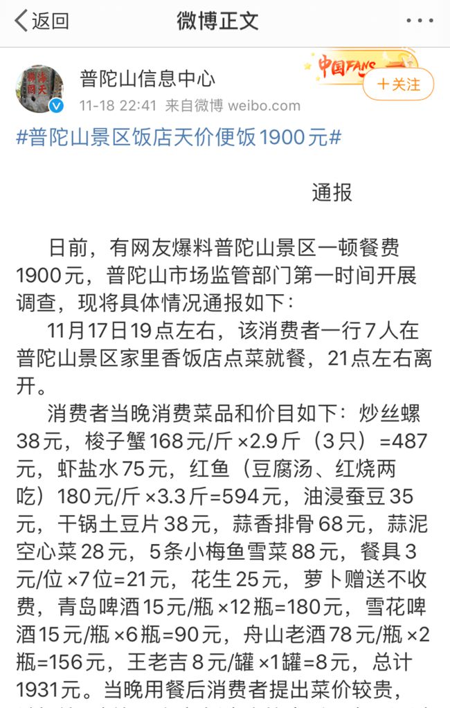 一頓飯1900多元,乍一看的確是挺貴的。于是當(dāng)?shù)厥袌霰O(jiān)管部門立即介入調(diào)查。昨晚22時41分,普陀山風(fēng)景名勝區(qū)通過其官方微博普陀山信息中心公布了市場監(jiān)管部門的調(diào)查結(jié)果。