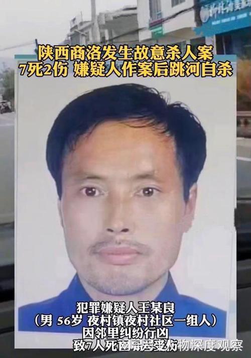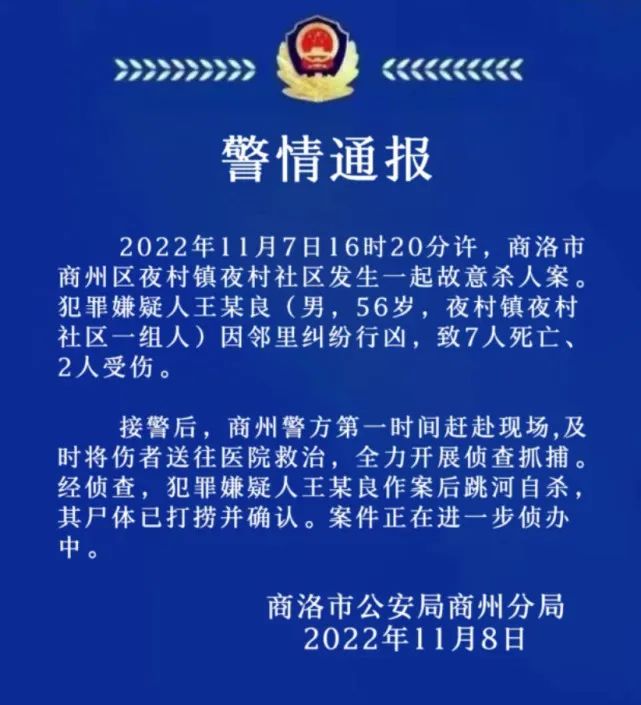 據商洛市公安局商州分局通報,2022年11月7日16時20分許,商洛市商州區夜村鎮夜村社區發生一起故意殺人案。犯罪嫌疑人王某良(男,56歲,夜村鎮夜村社區一組人)因鄰里糾紛行兇,致7人死亡、2人受傷。