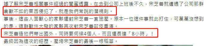據宋芝善的友人透露,宋芝善自從進入公司后,就遭到了殘忍的對待。一開始是公司的高層見色起意,后來高層又讓她接待其他男人。