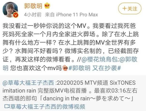 前段日子,有段時間沒動靜的郭敬明又上了熱搜。事情起因是5月13日那天,郭敬明發布了一支名為《少年之名》的MV。隨后不久,就有網友指出這支MV的創意涉嫌抄襲。郭敬明呢,按慣例,反手就是一頓懟。言辭之激烈,讓人隔屏都能感受到憤怒。雖然此次是否抄襲沒有官方認證,但是這其中反映的個人素質修養,也是和“導師”身份格格不入的!
