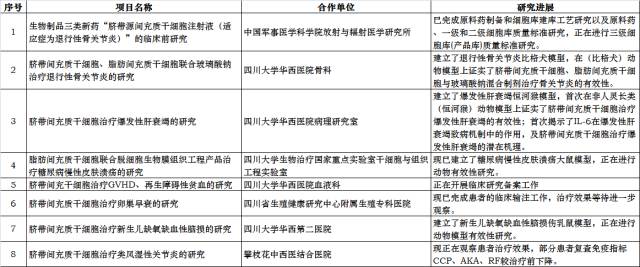 同時,實驗室還與中國軍事醫學科學院、四川大學華西醫院、四川省生殖健康研究中心、四川大學華西第二醫院、攀枝花中西醫結合醫院等開展臍帶間充質干細胞臨床研究如下: