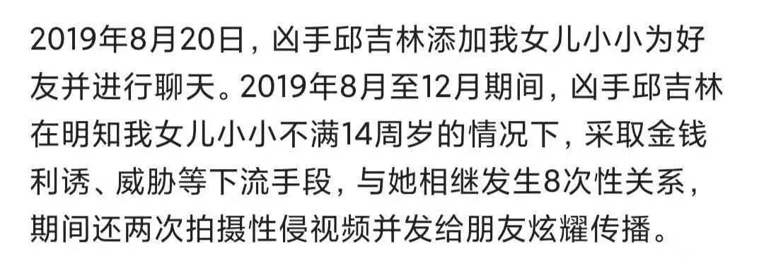 2019年8月至12月期間,4個月里,邱吉林在明知少女小小未滿14周歲的情況下,依然采取金錢利誘、威逼強迫等手段,在雙流區的酒店里,先后8次和小小發生性關系。
