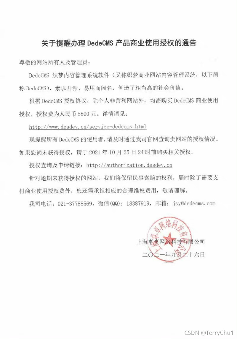 9月26日,dedecms(織夢)發布公告:除個人非盈利網站外,所有商用的個人、企業,均需要購買DedeCMS商業使用授權,授權費為5800元。“針對逾期(2021年10月25日24時)未獲得授權的網站,我們將保留民事索賠權利,屆時除了需需要支付商業使用授權費外,您還需承擔相應的合理維權費用。”在經歷了一年多的版權之爭后,織夢終于也收費了。