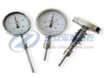 產(chǎn)品簡介 WSS系列雙金屬溫度計是一種測量中低溫度的現(xiàn)場檢測指針式儀表,其檢測溫度范圍在-80~500℃,主要用于直接測量各種生產(chǎn)過程中的液體、蒸汽和氣體介質(zhì)的溫度。雙金屬溫度計表盤形式有軸向、徑向、135°角型和萬向之分,每種可根據(jù)用戶現(xiàn)場安裝于觀察位置選定。而雙金屬溫度計可以根據(jù)現(xiàn)場使用環(huán)境和控制需要又可以做成電接點雙金屬溫度計、耐震雙金屬溫度計、遠傳雙金屬溫度計和防爆電接點雙金屬溫度計等系列產(chǎn)品,由于其具有安裝維護方便、形式多樣等特點被廣泛應(yīng)用于鋼鐵、冶金、石油、化工、環(huán)保、食品、水處理等需要對溫度的測量和控制的場合。 主要特點 現(xiàn)場顯示溫度,直觀方便;安全可靠,使用壽命長; 多種結(jié)構(gòu)形式,可滿足不同要求。 工作原理 雙金屬溫度計是基于繞制成環(huán)性彎曲狀的雙金屬片組成。一端受熱膨脹時,帶動指針旋轉(zhuǎn),工作儀表便顯示出所對應(yīng)的溫度值。 技術(shù)參數(shù) 執(zhí)行標(biāo)準(zhǔn):JB/T8803-1998 GB3836-83 標(biāo)度盤公稱直徑:60,100,150 精度等級:(1.0),1.5, 2.5(表盤60) 熱響應(yīng)時間:≤40S 防護等級:IP55 角度調(diào)整誤差:角度調(diào)整誤差應(yīng)不超過其量程的1.0% 回差:雙金屬溫度計回差應(yīng)不大于基本誤差限的絕對值 重復(fù)性:雙金屬溫度計重復(fù)性極限范圍應(yīng)不大于基本誤差限絕對值的1/2 溫度范圍的選擇:雙金屬溫度計作為指針式溫度計,其最大量程范圍的選擇應(yīng)該為正常工作溫度的1.5~2倍 ,最小量程范圍應(yīng)該是最大與最小值之和大于50℃ 測溫范圍