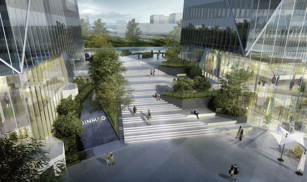 朝陽金茂中心定位為生態低密綠色的億級企業花園獨棟。建筑設計精工匠造,將鉆石造型設計理念延續到整個項目,鉆石立面、鉆石線條細節、切割線條景觀造型等,未來計劃將取得美國LEED金級認證,是中國金茂精心打造的商務生態辦公旗艦產品。項目中央景觀達萬余平方米,中央景觀整體下沉6米,采用現代簡約的設計風格,簡約的風格與建筑外立面相得益彰。景觀注重與人的互動性,精心設計了陽光草地、森林步道、疊水臺階、頭腦風暴區、私享花園等區域,每個景觀節點都充滿創意,致力于為入駐企業員工提供一個生態、綠色、互動性、國際化的全新商務體驗。