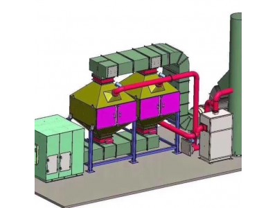 活性炭吸附脫附階段:經過前面的預處理后,廢氣通入后端的活性炭塔進行吸附處理,通過活性炭表面的孔隙吸附廢氣分子,吸附廢氣。當活性炭飽和后,把裝置切換到脫附模式,對活性炭進行脫附。脫附新鮮空氣首先經過新風入口的換熱器和電加熱室進行加熱,將空氣加熱,進入活性炭床,炭床受熱后,活性炭吸附的廢氣會揮發出來,此時廢氣變成高濃度小風量的廢氣。