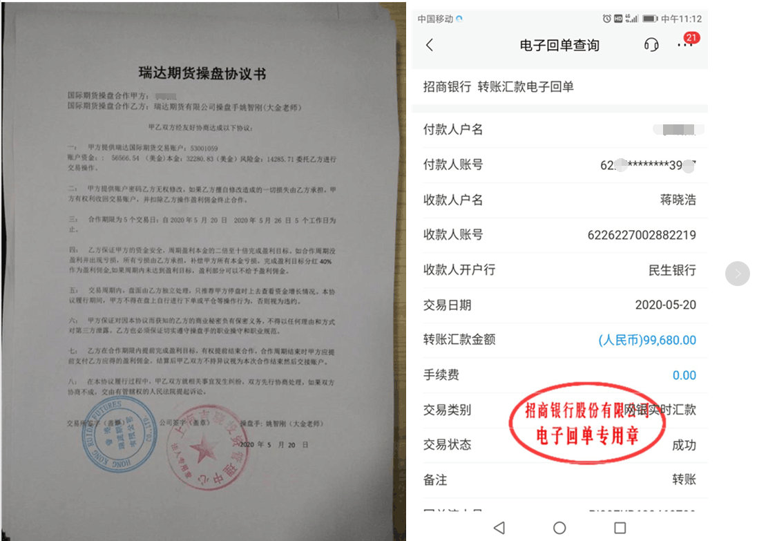 據另一名投資者描述他的經歷又是截然相反,李先生說他在瑞達期貨投資平臺投入了40萬,他不斷沒有虧錢反而賺了80多萬,但是不能出金,問題出在老師替他操盤簽了一份操盤協議,協議中說明盈利了委托人要支付40%盈利分成,在與老師協商后老師答應李先生先支付10萬元,就可以出金了,當李先生真的把10萬打過去后,老師又說公司不同意,必須將盈利分成32萬元全部支付才能給出金,直到這一刻李先生才醒悟他們這是連環(huán)套,入金40萬加上分成10萬,他已經被騙50余萬,從上面兩個案例你能看出什么嗎?他們?yōu)榱丝焖偈崭钜呀洸粶y手段了,如果你也遇到這樣的投資騙局保存好相關證據,聯系我,幫你出謀劃策,提供法律援助,幫你挽回損失。