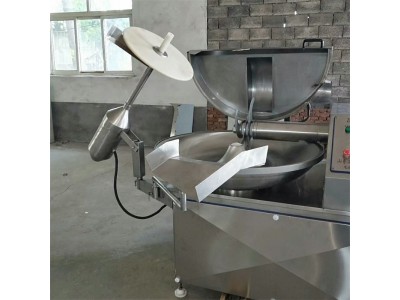 斬鍋由電機通過減速機低速旋轉,不斷向刀組送料。刀軸由雙速電機(或變頻電機)經皮帶帶動高速旋轉。原料在斬鍋中作螺旋式運動的同時,被刀組攪拌和切碎并排除肉糜中的空氣,由于切刀的高速斬切,減少了產品的液汁分離率,保證了乳化效果,增強了產品的彈性和細膩度。