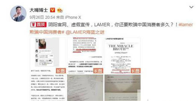 貴婦品牌LAMER被微博致命美妝博主告上法庭,原因是其虛假宣傳并不存在的修復疤痕功效,LAMER欺騙中國消費者購買,而且僅在中國虛假宣傳,該行為已嚴重違反我國廣告法。
