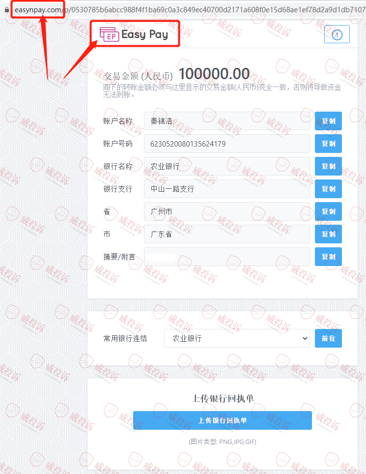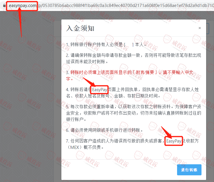 如果大家留意,排在最前面的一個入金通道叫支付銀聯(lián)E,聽說這個通道幾乎占了所有入金的80-90%,為什么一個通道可以承包這么多入金呢?原因是因為這個支付通道E(支付公司叫Easy Pay,如下圖), 是MEX大通金融支付部門負(fù)責(zé)人的男朋友開的,正所謂肥水不流外人田,這位支付部門負(fù)責(zé)人當(dāng)然要把她男朋友的通道放在第一位,據(jù)說在中間加了不少點,光撈中間流水的傭金就讓她肥得漏油了。