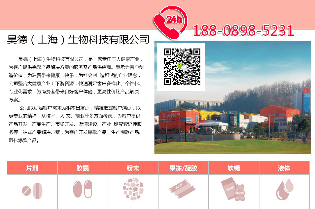 昊德(上海)生物科技有限公司專注于大健康產業,我們利用多年行業經驗以及專業化團隊,為客戶提供一站式、一對一,多樣化、個性化、專業化的服務,助力品牌商解決產品開發、生產、品牌規劃等難題,使其專注于渠道建設和產品銷售上
