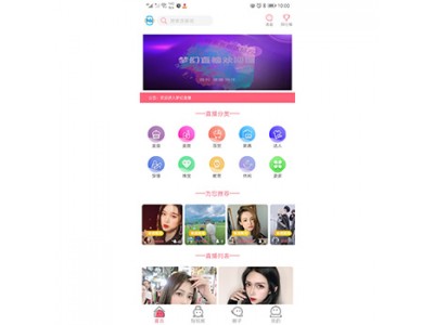 1、首頁:搜索欄、消息界面、排行榜、輪播圖、公告、直播分類、直播列表
