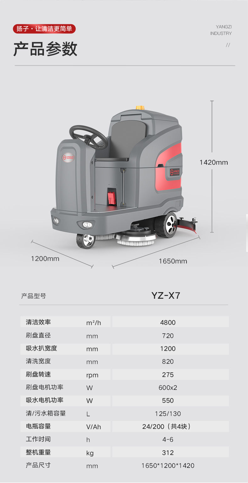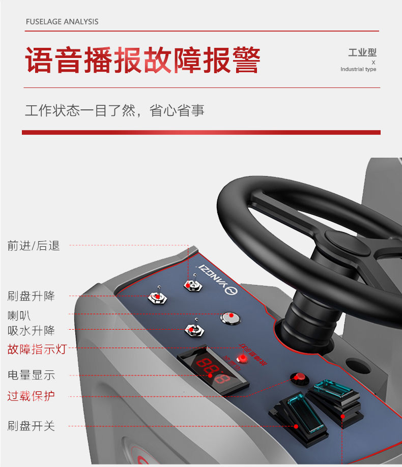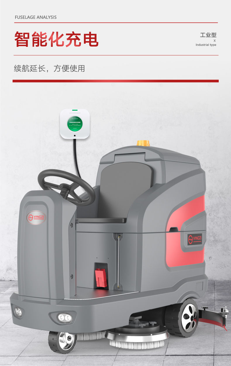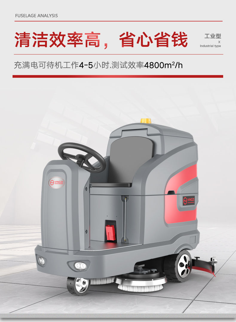 揚子X7駕駛式洗地機車 配置有200Ah天能電瓶,品牌電瓶可以增長機器的使用壽命,后期更換更加方便。大容量138L的清水箱,可持久使用,不用頻繁換水,效率更高,每小時可清潔6000m,智能化操作系統,如水位感應器、語音播報、智能充電,操作更容易上手,并且使用的是阿美德格進口電機,比普通電機的壽命高6倍,輕松降低地面揚塵污染,給員工提供干凈舒適的就業環境!轉彎靈活,清潔不留死角,操作輕便,采用電池驅動,無噪音,節能環保,無二次污染。可免工具更換刷盤及吸水膠條。