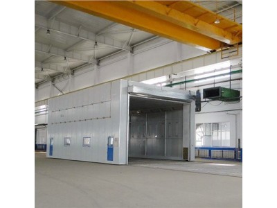 整體移動噴漆房主要用于大型工件的打磨或噴漆,便于收集工作中產生的粉塵或廢氣。一般情況下,每套房配有2-3個排氣凈化站。當哪個工位上的工件需要噴漆時,房間移動到那個工位,其他工位可以繼續(xù)拋光。當室內的工件涂漆后,控制移動室移動到拋光工件工位。這種設計可以實現(xiàn)大型工件的不間斷連續(xù)涂裝。房屋為鋼結構,房屋的立柱下有兩個電動行走機構,行走機構沿地面軌道行走。移動房兩端安裝電動卷簾門。當房間行走時,門上升,當房間到達位置時,門著陸并關閉。門和行走機構由電氣控制部分連鎖控制,只有門升起后,房間才能移動和行走。