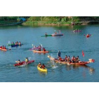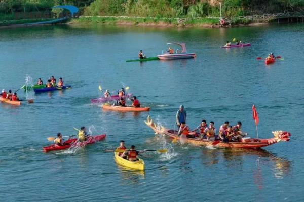 斗龍舟,亦稱"扒龍船"。是紀(jì)念和祈求五谷豐登的一種儀式。舟長五丈多,由五塊大樟木板制成。舟有龍頭、龍尾,舟身涂滿彩色鱗甲,上插紅布長旗,寫有"風(fēng)調(diào)雨順,國泰民安"字樣。