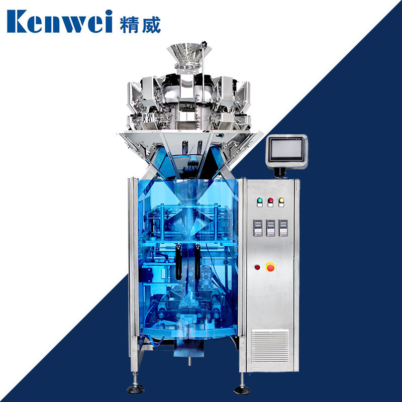 3、自動多頭秤和立式包裝機(jī)組合一體,秤量包裝一體PLC程序控制,全自動完成計(jì)量、充填制袋、打印日期、包裝輸出;