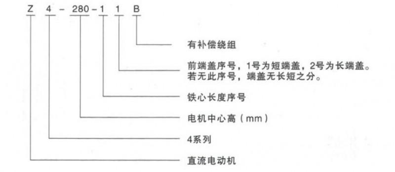 西安泰富西瑪Z4系列直流電機(jī)以Z4-280-11B為例,Z表示直流電動(dòng)機(jī),4表示4系列,280表示電機(jī)中心高(mm),第一個(gè)1表示鐵心長度序號(hào),第二個(gè)1表示前端蓋序號(hào),1為短端蓋,2為長端蓋,B表示有補(bǔ)償繞組。