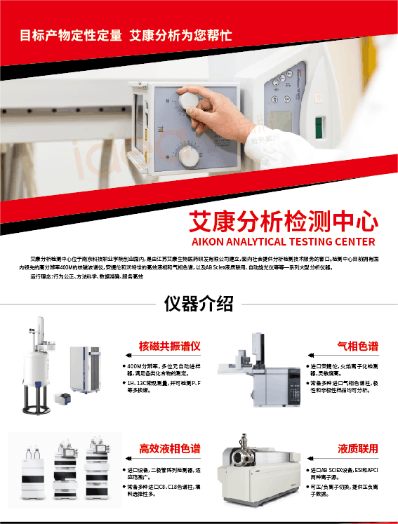 南京艾康全心分析檢測(cè)中心目前擁有國(guó)內(nèi)xian進(jìn)的高分辨率400M的核磁共振波譜儀,全套Agilent系列的液質(zhì)聯(lián)用儀、氣質(zhì)聯(lián)用儀、高效液相儀、氣相色譜儀以及各種理化分析儀器等一系列大型分析儀器。